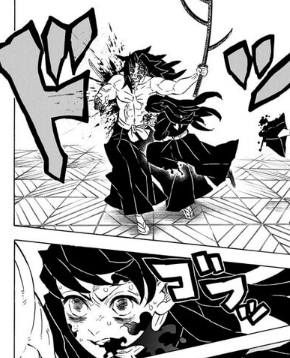 その代償として、黒死牟の全身から放たれた無数の刀によって胴体を真っ二つにされてしまいました。