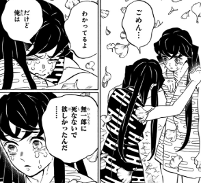 死の間際、兄・有一郎が「こっちに来るな 戻れ!!無駄死にだ」と涙ながらに叫び、無一郎は「僕は幸せだったよ。無駄死になんて言わないで。兄さんだけはそんなふうに言わないでよ」と答えます。