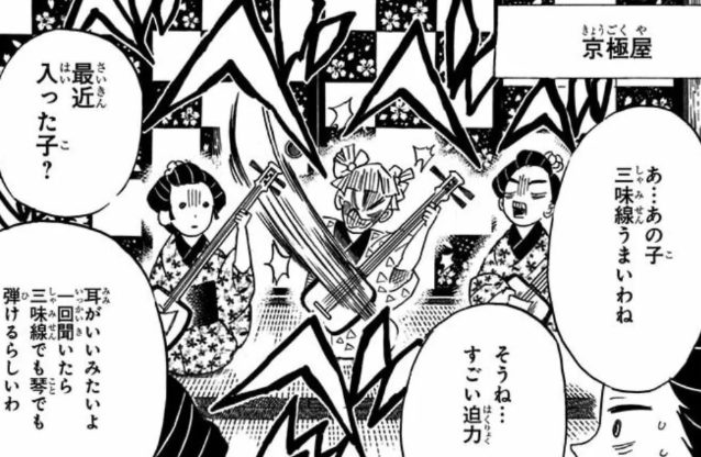 - 鳴女も善逸も弦楽器の演奏が得意で、作中でも善逸は三味線、鳴女は琵琶を巧みに操る点が共通している