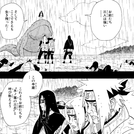 半蔵は「この勝負は木ノ葉の勝利だ。お前たちを生かしておいてやろう」と命を助け、「木ノ葉の三忍」と命名し、この戦いが三忍の伝説の始まりとなったのです。
